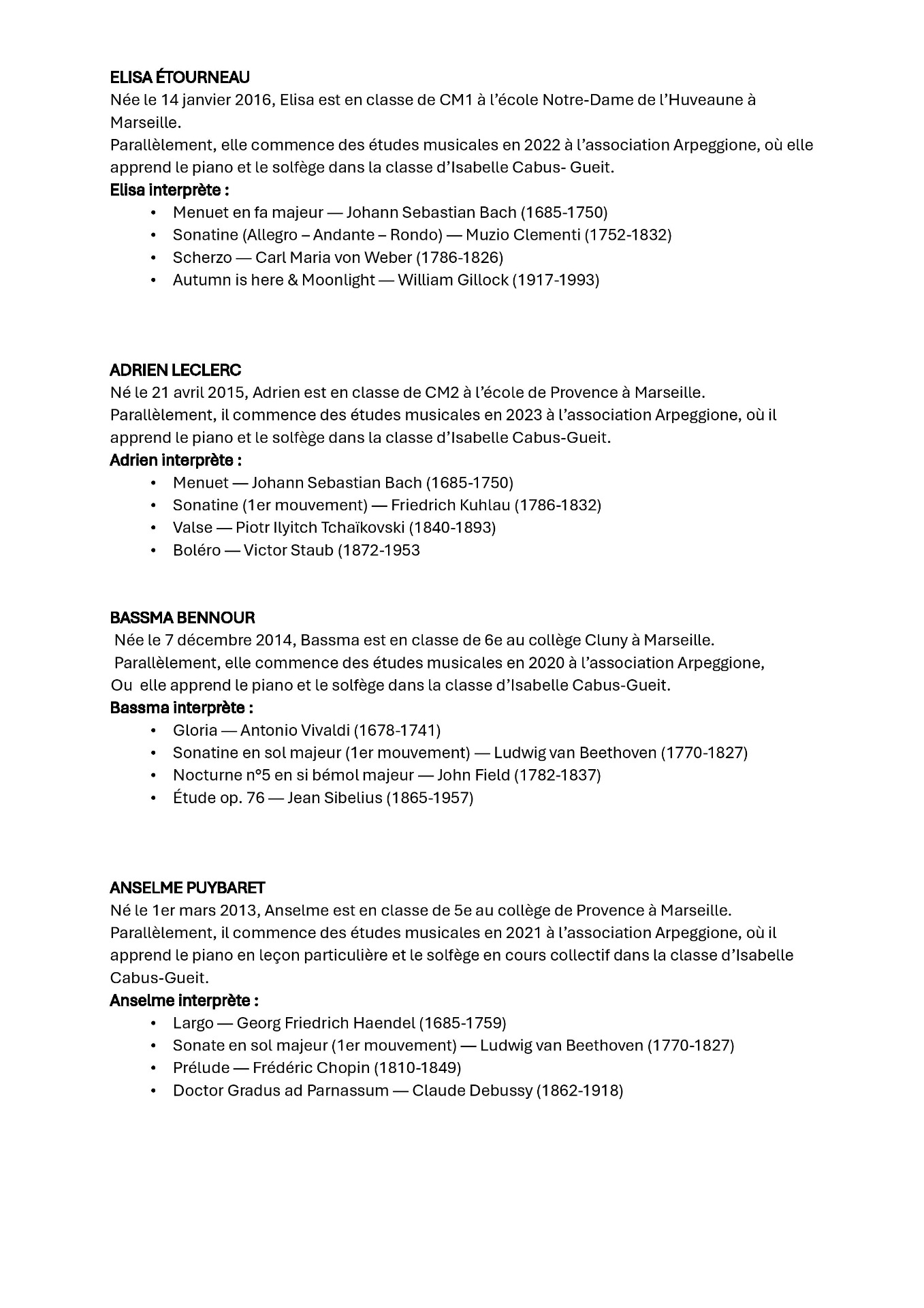 • Auditions d'élèves